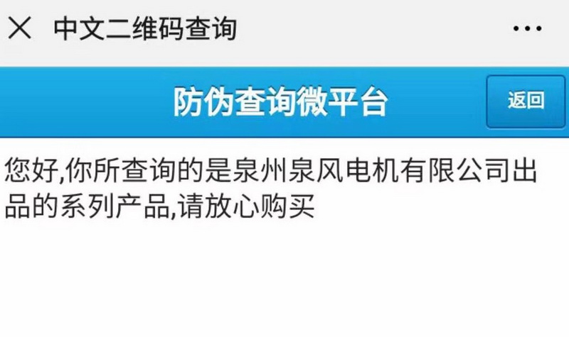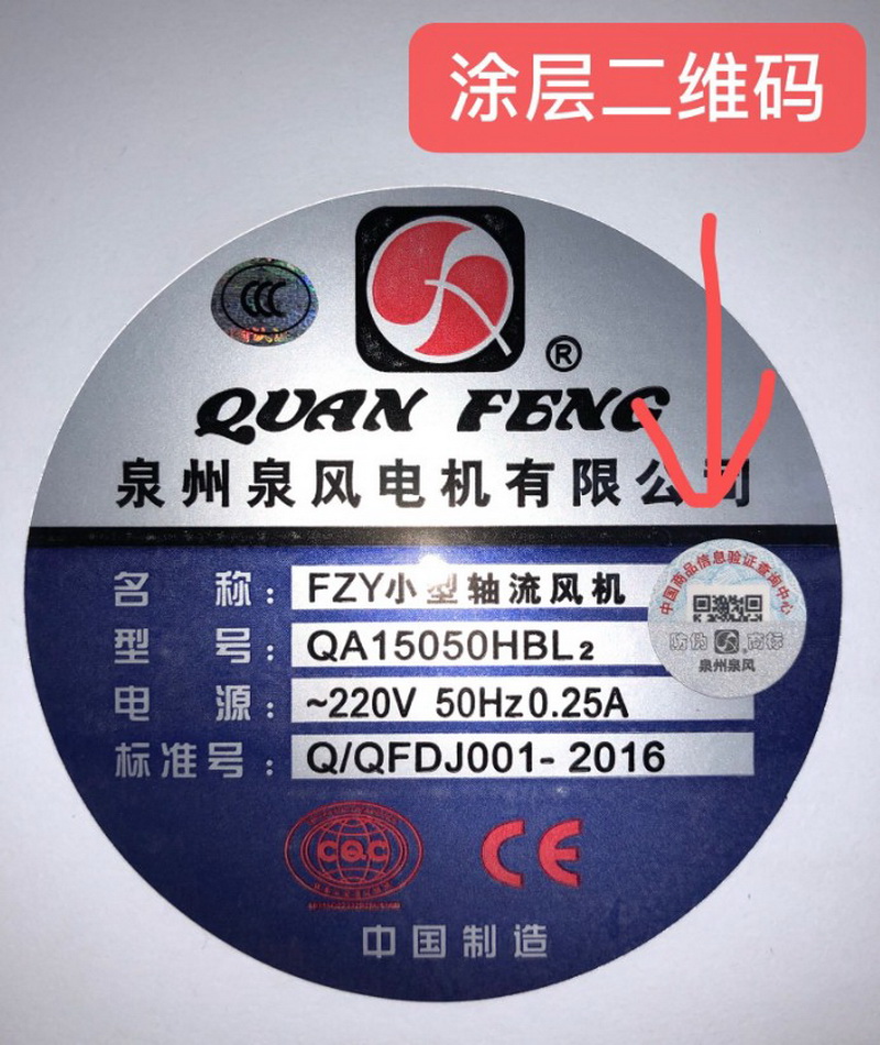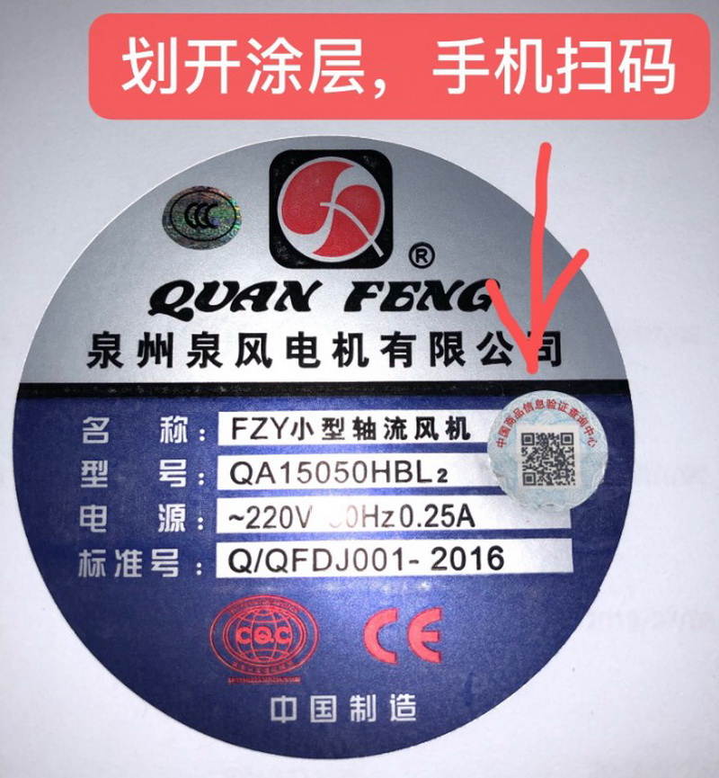 2019年7月18日開始,所以我司生產(chǎn)的風(fēng)機(jī),均增貼二維碼防偽標(biāo)。刮開涂層可以手機(jī)掃描。一機(jī)一碼,首次掃描顯示泉風(fēng)正品。掃描第二次會提示非首次查詢,謹(jǐn)防假冒。